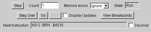 When the current instruction is a BSR, JSR, or CALL then this button will execute the subroutine as in the "Go" button, and stop execution when the subroutine returns. If the current instruction is something else, then behaves like the "Step" button with a count of one; however in the situation where the processor is in "Wait" state, the Step Over button will cause time to pass until the processor leaves wait state. The Stop button can be used to cancel execution. Step Over is inactive while in Stopped state.