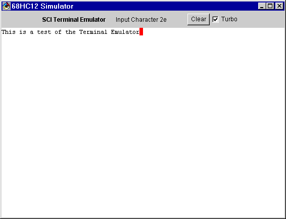 The 68HC12 Simulator simulates one SCI port, SCI0. To maximize its usefulness, it is assume connected to a terminal emulator.