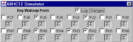 These ports have check boxes for pins programmed as inputs and display boxes for pins programmed as outputs. Outputs are not updated while simulations are running, however inputs are active when simulations are running via the "Go" or "Step Over" buttons.